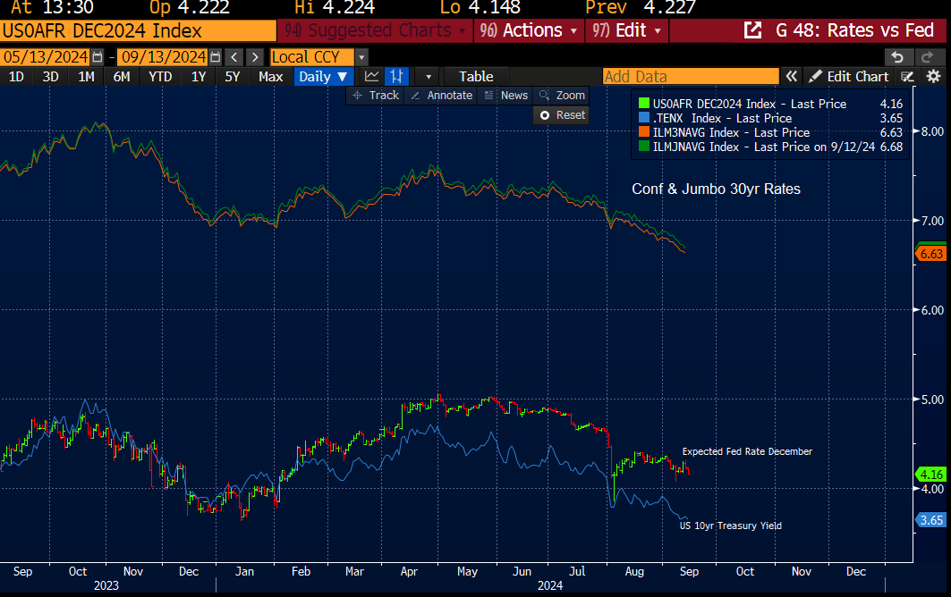 In all, there will be 100bps of rate cuts expected by the markets for the remainder of 2024. So, what are mortgage rates going to do? Likely NOTHING – it's ALREADY happened! From April to now, the expected Fed rate at year end dropped by 100bps, give or take. In that same period, the average 30yr rate on jumbo and conforming mortgages dropped by about…….**drumroll**…..100bps. The yield on the US10yr note also fell by 100bps, going from 4.70 to 3.70.